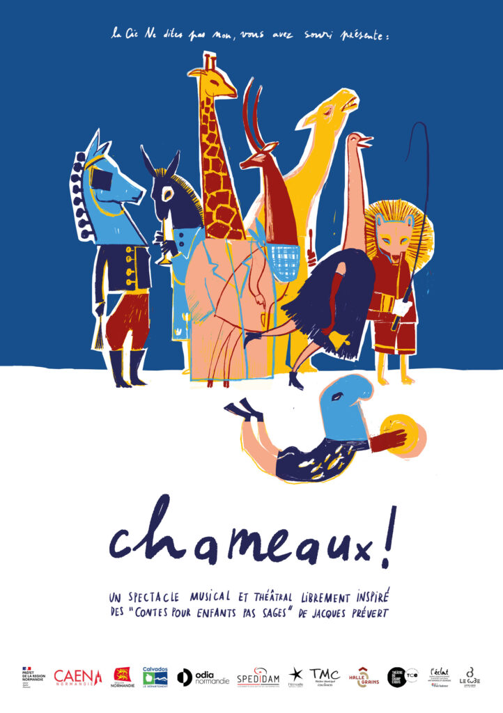 Librement inspiré des Contes pour enfants pas sages de Jacques Prévert, Chameaux ! est un spectacle musical et théâtral joyeusement irrévérencieux. Sur scène, un comédien et un trio de musicien.ne.s indociles incarnent les personnages tout droit sortis de l’imaginaire de Prévert : dromadaire maltraité, lion trop naïf, autruche émancipatrice, girafe muette, cheval en quête de révolte…ou peut-être simplement des enfants qui refusent de plier devant les règles absurdes des adultes.