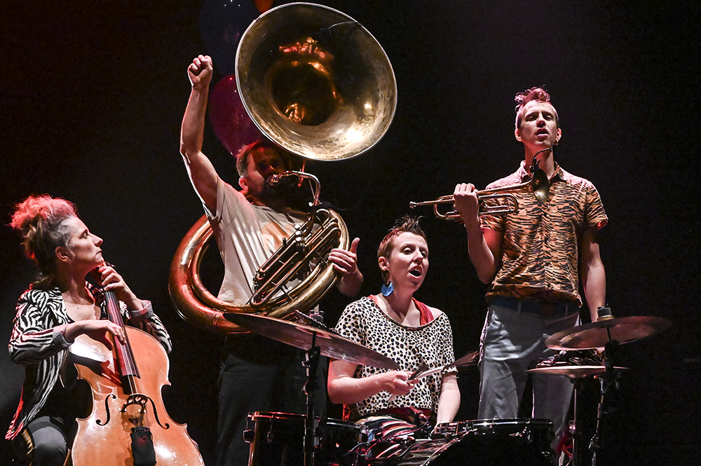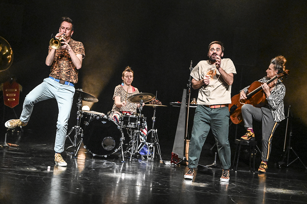 Avec humour, espièglerie et profondeur, ce quartet fougueux donne vie à des récits drôles et cruels, qui dénoncent des situations de domination, la peur de l’autre, le dressage des corps et des esprits. Une partition inventive où théâtre et musique live s’entrelacent dans une forme légère, mobile et hautement vivante.